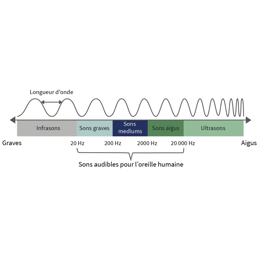 L’oreille humaine peut percevoir une grande amplitude de sons, de 20 Hz à 20 000 Hz (image 2). Le son est produit par la vibration d’un corps. Il se propage à travers un milieu où il va rencontrer des perturbations, qui vont créer des zones de compression et de dépression, ce qui provoque les oscillations des ondes. C’est la pression acoustique, mesurée en Pascal (Pa).