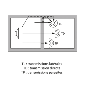 L’objectif de l’isolation acoustique est de réduire la transmission du son depuis sa source jusqu’aux lieux que l’on cherche à protéger. Il existe trois chemins : la transmission directe à travers une paroi séparative, les transmissions latérales et les transmissions parasites notamment liées au passage des réseaux (image 1).