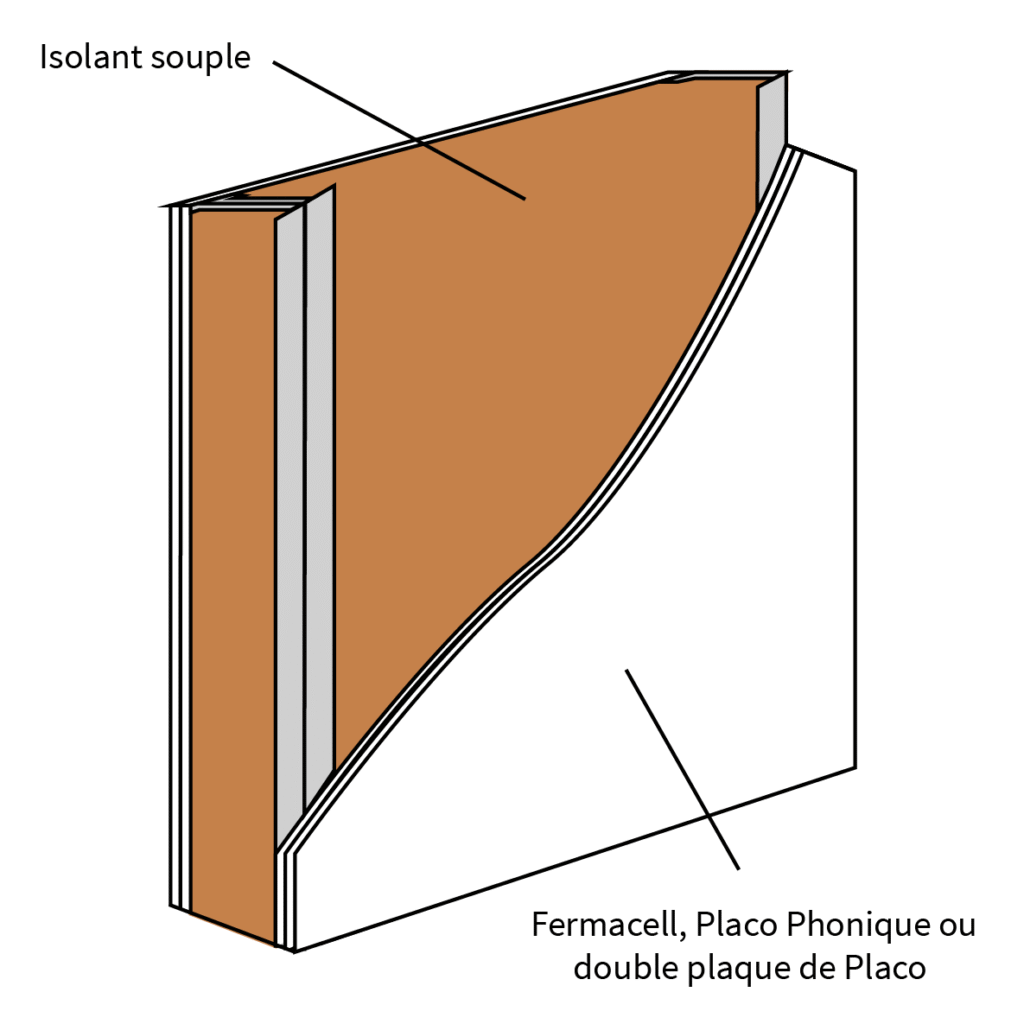 Il existe une autre solution quand on ne peut pas apporter de la masse : la double paroi. Le système de double paroi repose sur le principe masse-ressort-masse. Le rôle du ressort est de désolidariser les deux parois afin d’atténuer la transmission solidienne. Une simple couche d’air peut jouer le rôle de ressort, mais pour optimiser le système, on ajoute habituellement un isolant dans l’espace entre les parois.