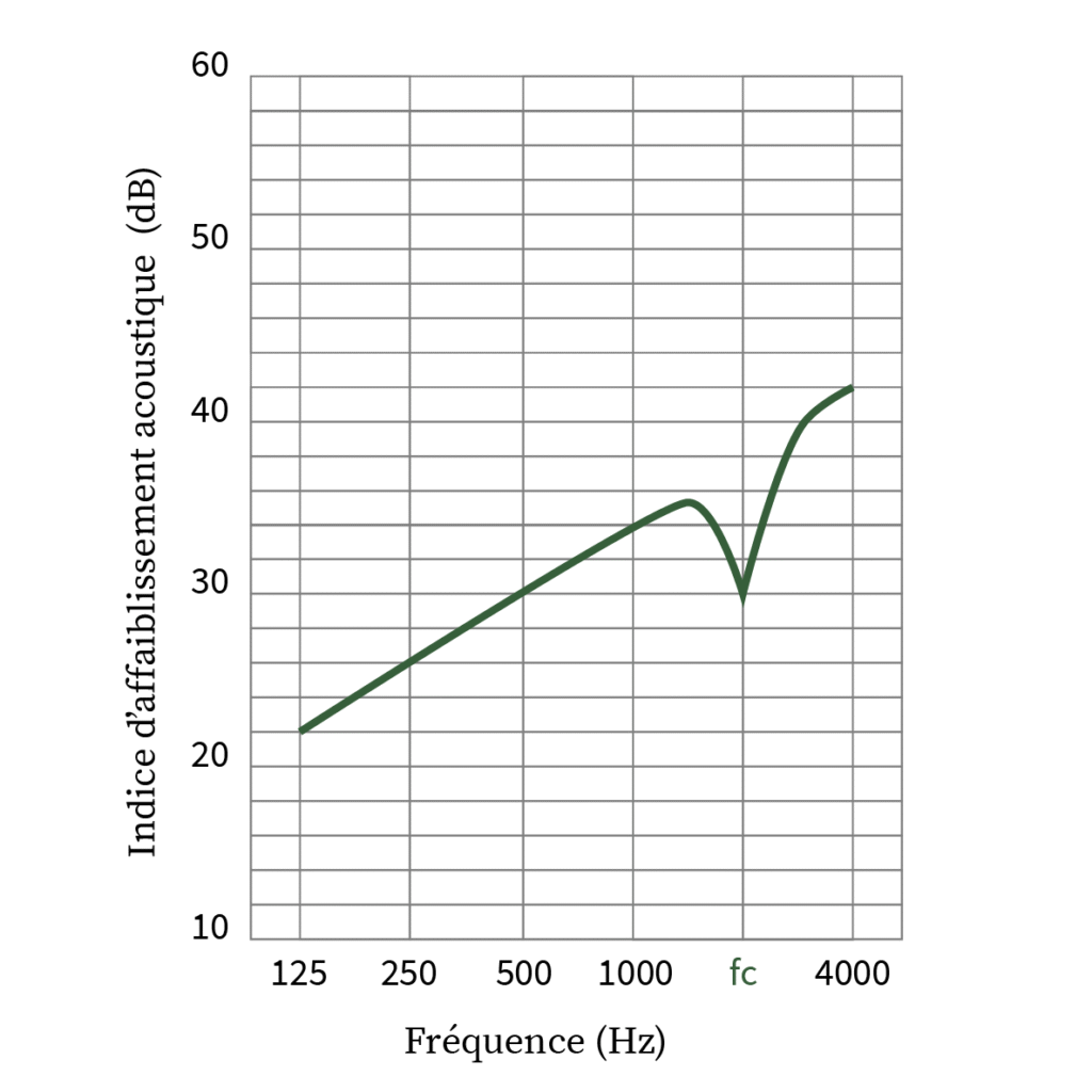 Il faut savoir que toutes les parois simples présentent un défaut d’isolement à une certaine fréquence, appelée fréquence critique fc (image 2). Elle dépend de la nature et de l’épaisseur de la paroi et peut varier de 3 à 10 dB. Dans le cas d’une double paroi, c’est la fréquence de résonance qui fait rentrer en résonance le dispositif et qui constitue un défaut d’isolement.