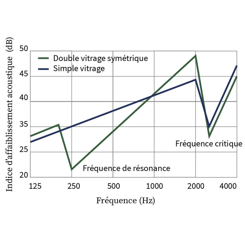 À noter que le double vitrage est une double paroi et est donc soumis aux mêmes phénomènes de fréquence critique et de fréquence de résonance (image 3). La nature du gaz entre les vitrages n’influence pas les performances acoustiques. Il existe des vitrages spécifiques pour améliorer les performances acoustiques (double vitrage asymétrique, double vitrage intégrant un vitrage feuilleté acoustique).